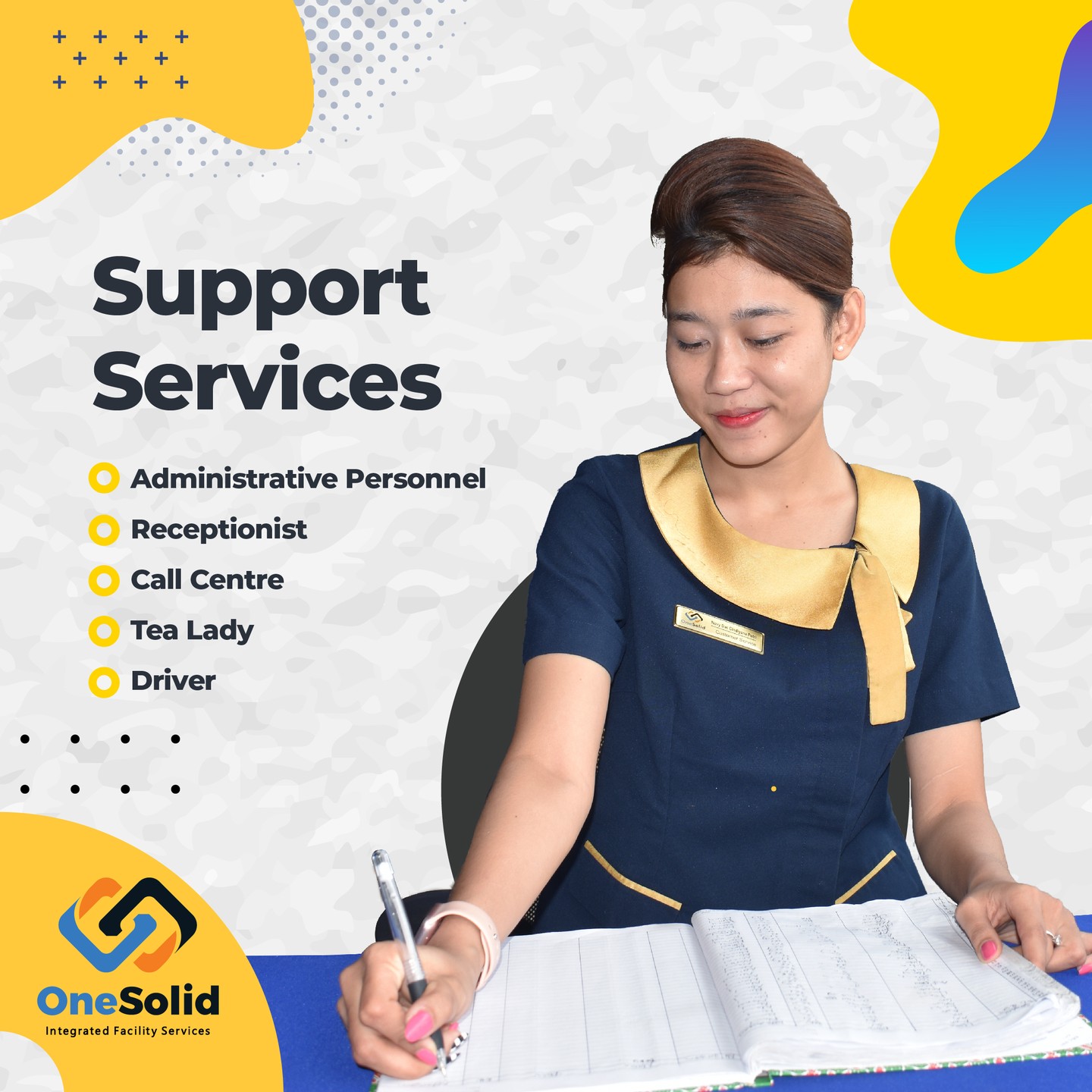 Sebagai pendukung aktifitas bisnis suatu perusahaan , OneSolid Support Services hadir menyediakan tim karyawan terbaik melalui tahap seleksi untuk menjadi bagian dari tim utama perusahaan anda.